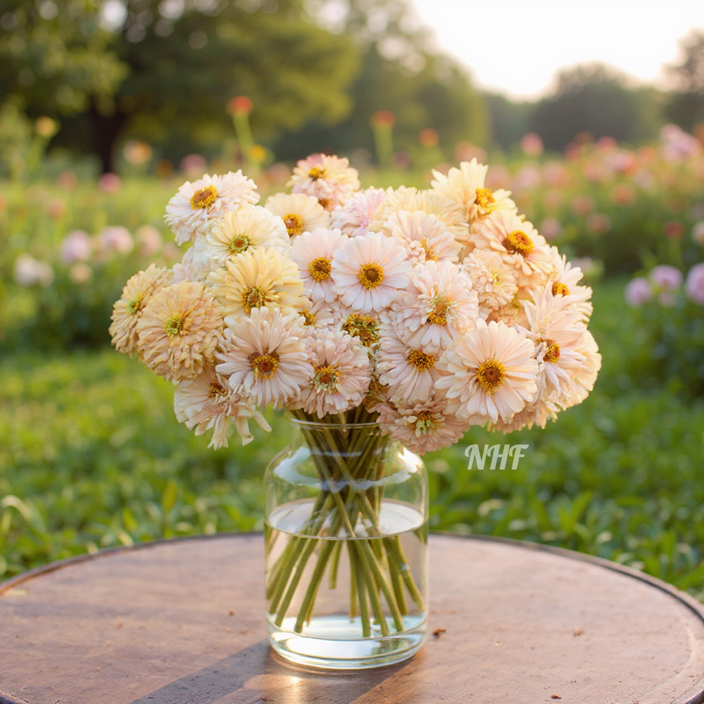 Up for sale is one pack of 20 "Honey Rose" Blush Zinnia flower seeds. These flowers are large fully double 3" to 4" peony type flowers that grow on long 36" stems with petals in a mix of blush shades from warm honey to light pink blush.